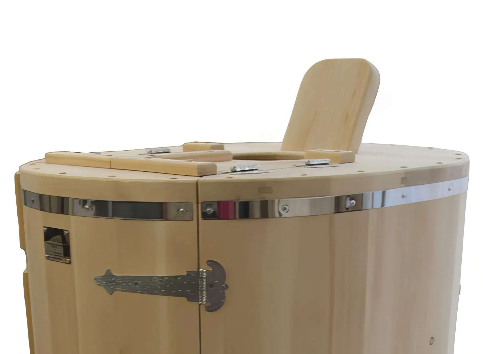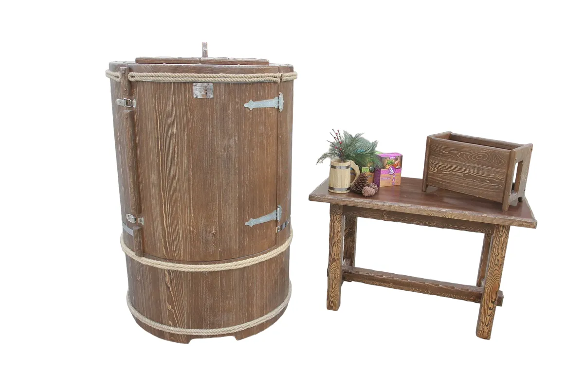 Готовый комплект - это полностью укомплектованный набор с фитобочкой для процедур парения. Круглая модель наиболее компактна и мобильна. Толщина стенок составляет 25 мм. Фитобочка оборудована откидными створками, дверцей и отверстием для головы. Верхний скос изделия делает положение головы более комфортным и улучшает обзор. Во время парения человек сидит внутри кедровой бочки, а голова находится снаружи. Благодаря этому исключается возможность перегрева. Подлокотники из кедра, встроенные ручки на створках и двери делают эксплуатацию более удобной.