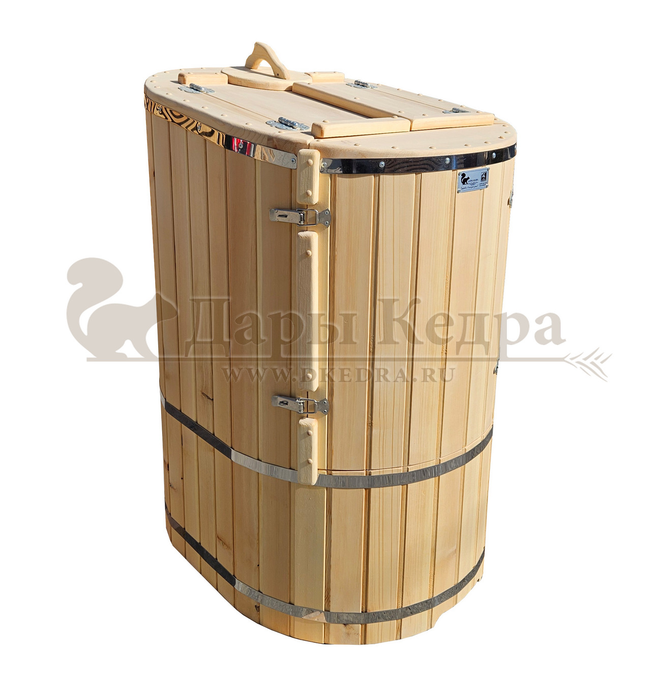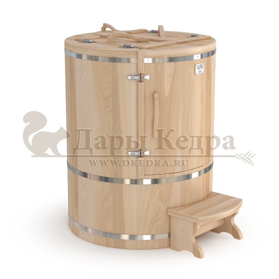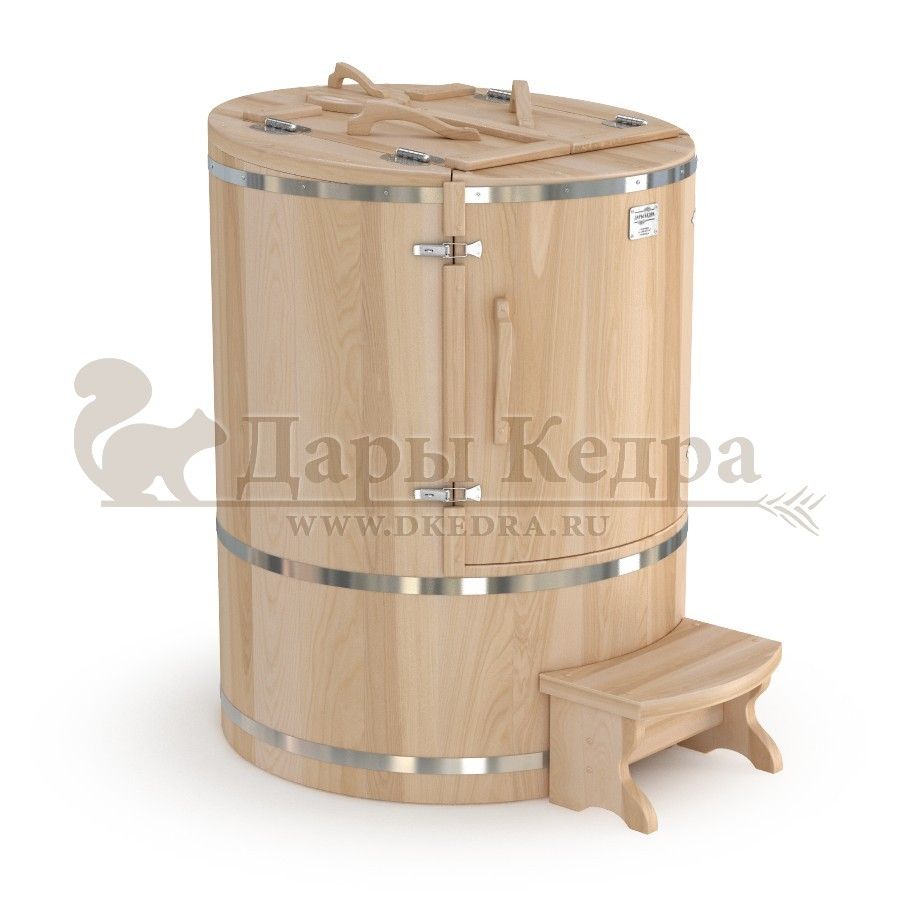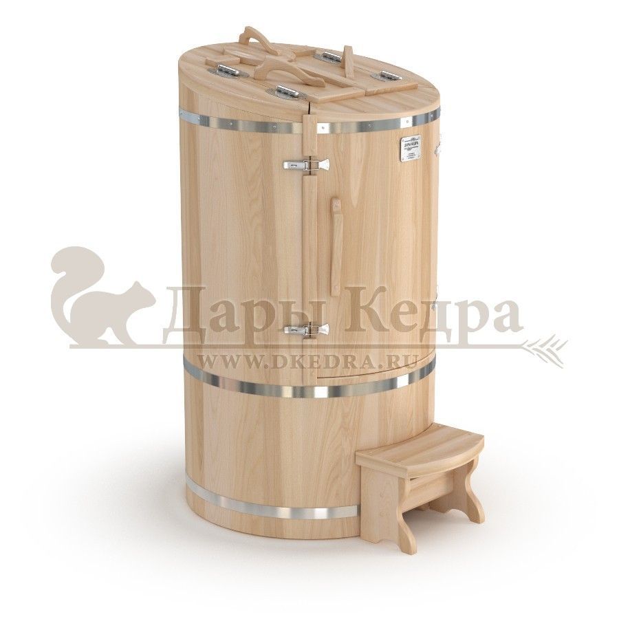 Кедровая бочка (фитобочка) овальная «Классическая» Овальная фитобочка из кедра - это мини парная, которую можно использовать не только в спа-салонах, но и дома. Овальная модель более просторна и удобна в использовании. Толщина стенок составляет 25 мм. Она оборудована откидными створками, дверцей и отверстием для головы. Во время парения человек сидит внутри кедровой бочки, а голова находится снаружи. Благодаря этому исключается возможность перегрева. Подлокотники из кедра, встроенные ручки на створках и двери делают эксплуатацию более удобной. Парение в фитобочке благотворно влияет на организм в целом: повышается иммунитет, выводятся шлаки и токсины, улучшается работа органов тела и состояние кожи.