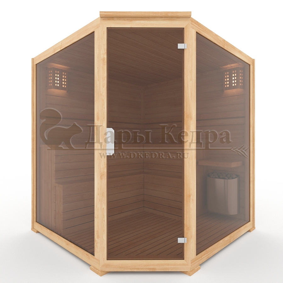 Это специально оборудованная деревянная кабина для сухого и влажного парения. Электропечь нагревает пространство внутри и позволяет сбрызгивать камни водой, слегка увлажняя воздух. Такая процедура позволяет избежать перегрева. Двойные стенки кабины с теплоизоляционным материалом удерживают тепло. Установка сауны в угол позволяет рационально использовать пространство помещения. Финская сауна с электропечью подойдет, как для домашнего использования, так и для коммерции. Доставляется в разборном виде щитами, собирается по инструкции с помощью шуруповёрта.